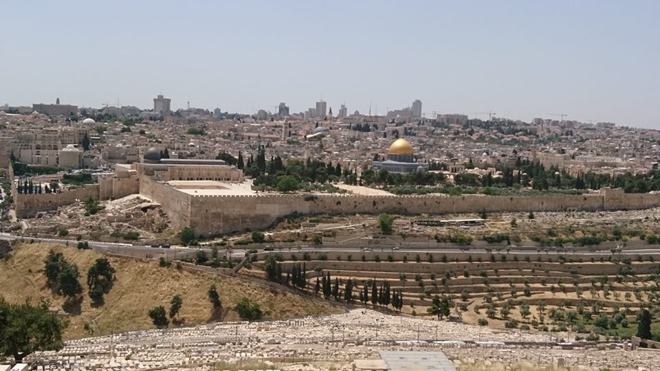 The Mount of Olives today. The trees in the Garden of Gethsemane are over 800 years old and are believed to be grown from shoots that lived when Jesus was there. The church of all nations sits beside them.