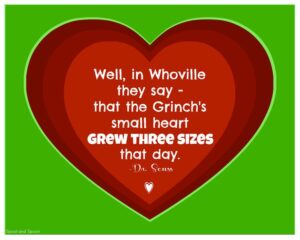 Our holidays of Thanksgiving and Christmas are both based on historical facts and traditions.  We should never lose focus of the true meaning behind them.  Apparently, that is what happened to the Grinch. The Grinch tried to ruin Christmas by stealing everything he thought made it special.  Then he leaned in to hear crying but heard singing instead. How could Christmas come if there weren’t any decorations, food or toys?  Then he thought, maybe the gifts of joy and love don’t come from the store!  The people of Who-ville showed that happiness comes from within, not from material things.