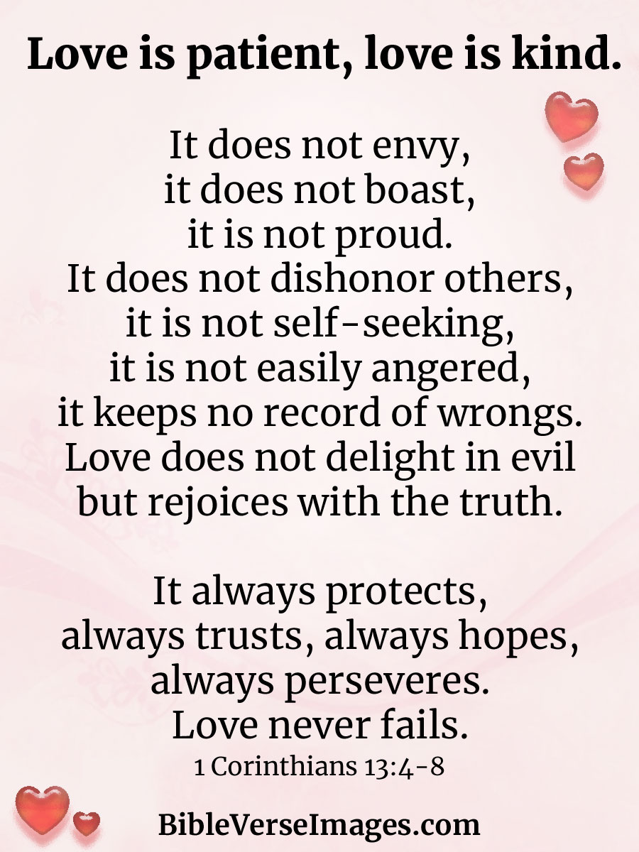 The ancient Greeks identified several distinct types of love, most notably Eros (romantic/passionate love), Philia (affectionate, friendship love), and Agape (selfless/unconditional love).We need to understand that real love is not the romantic, mushy feelings portrayed in movies. The Apostle Paul gave a fairly clear definition of God’s kind of love. This verse is often read at weddings but he meant us to show God’s love in everyday living. Here is the key, loving others isn’t about me!